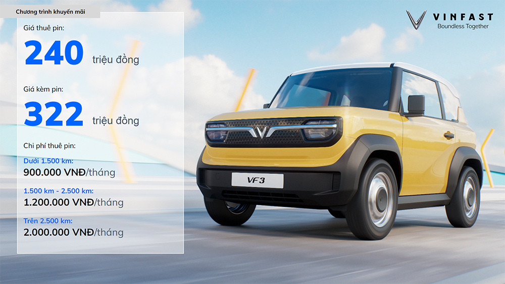- Phí thuê pin là 2.700.000 VNĐ khi đi dưới 1500km 4.500.000 VNĐ khi đi dưới 3.500km hoặc 6.900.000 VNĐ đi từ 3.500km trở lên mỗi tháng.